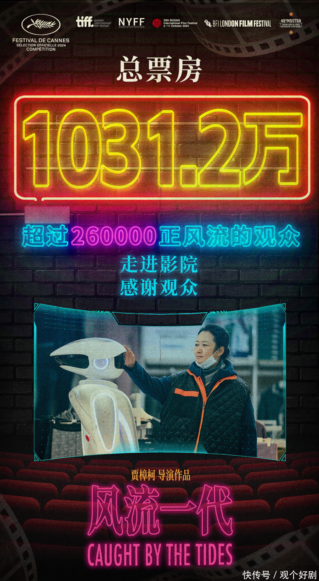 驱散现在,《风致一代》累计票房已达1031.2万元,招引卓著26万名不雅众走进影院。自路演开启以来,《风致一代》与不雅众张开了一场跳动20座城市的深情对话。贾樟柯导演切身参与84场疏通看成,与17251位不雅众面临面疏通,这些场次平均上座率高达95%。