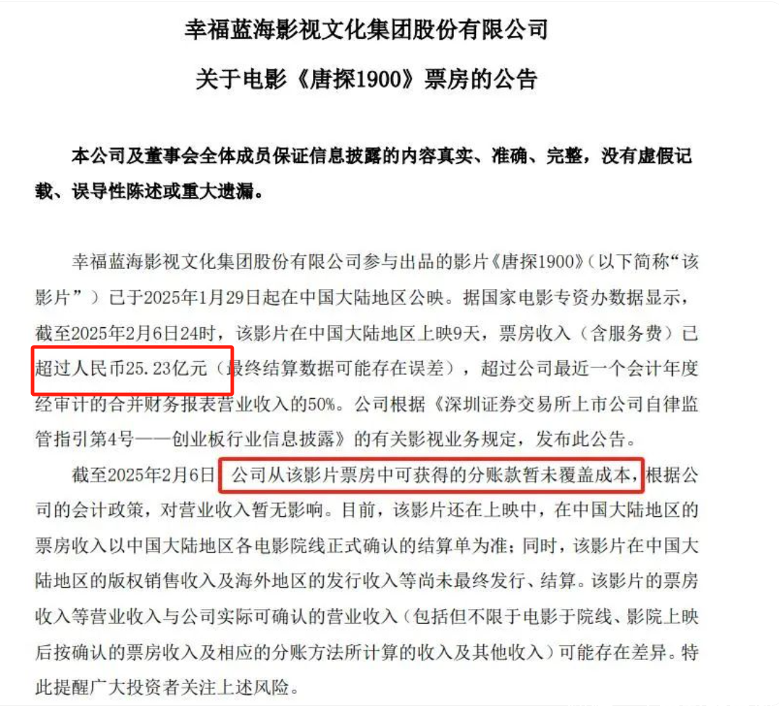 参与电影投资的幸福蓝海,发公告走漏称,为止2月6日,《唐探1900》票房收入卓绝25.23亿,但公司从该影片票房中可取得的分账款暂未消逝资本,凭据公司的管帐策略,对生意收入暂无影响。
