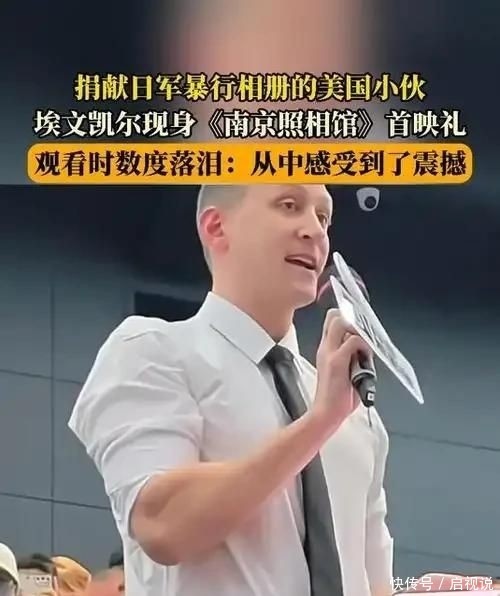 二战相册捐赠者埃文·凯尔坐在北京首映礼上,泪水滑过面颊。