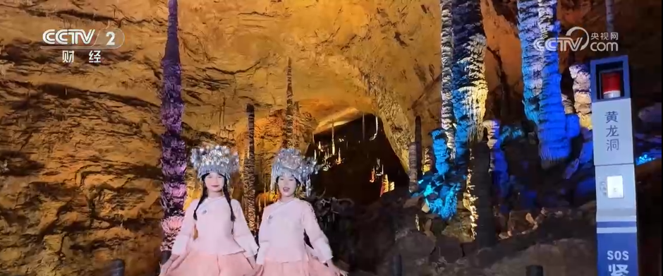 在黄龙洞地来世界,身着多民族衣饰的非遗快闪军队以溶洞为T台,进行时装秀巡游。