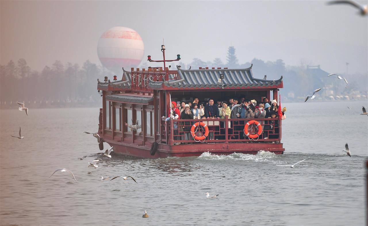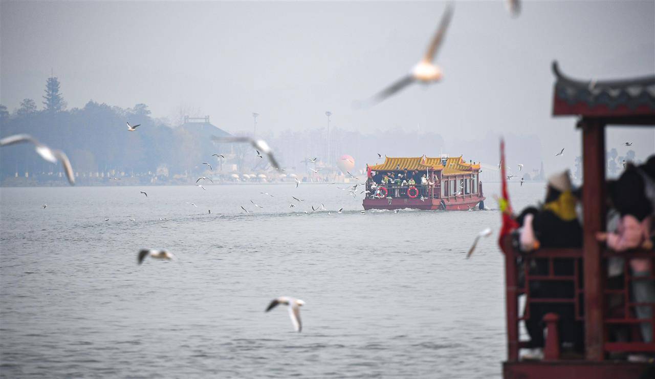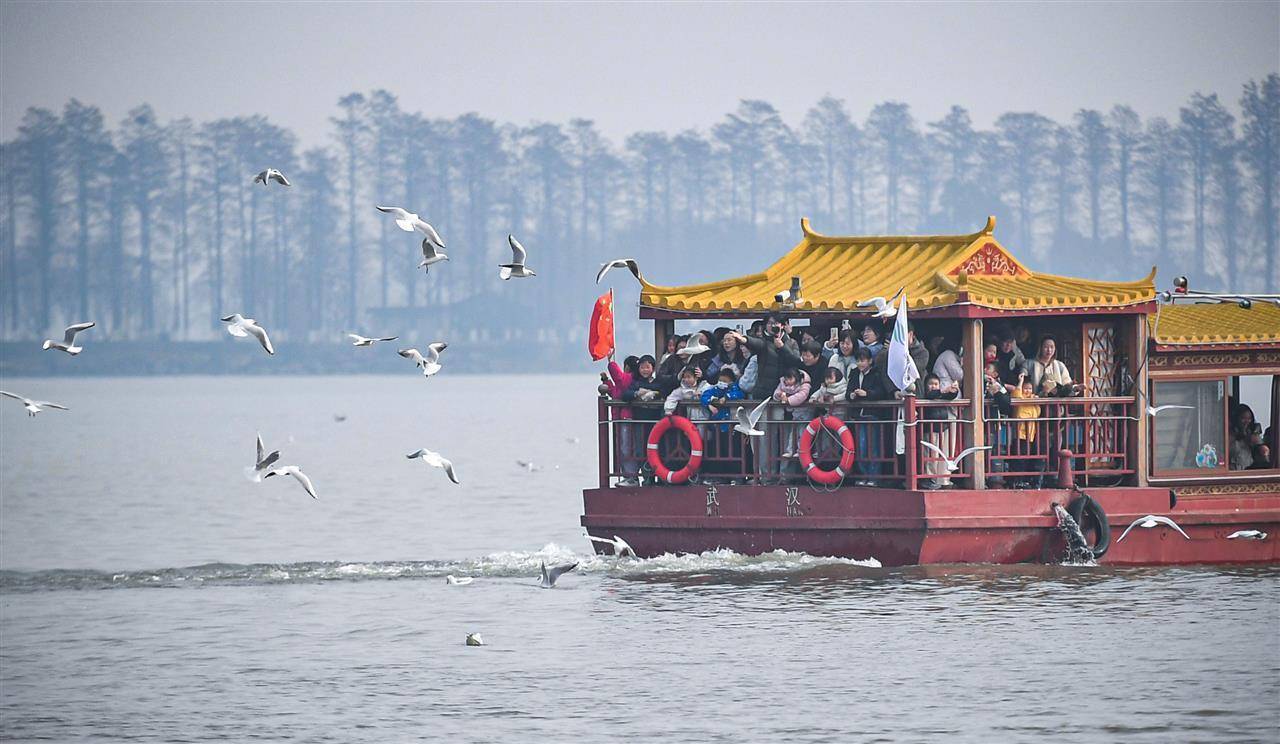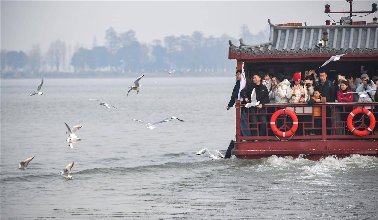 游船上的搭客,有东谈主拿出提前准备的食品投食,看着红嘴鸥争相啄食,更多搭客举起手机、相机,定格下东谈主鸥相依的温馨短暂。