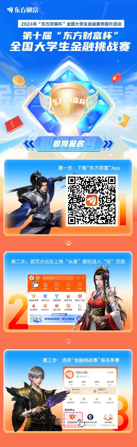 2.东方钞票APP报名:扫描下方二维码,下载“东方钞票”APP,首页左上角点击“我”头像,下拉到行为中心,点击“金融挑战赛”报名参赛;或首页搜索框径直搜索“金融挑战赛”报名参赛。