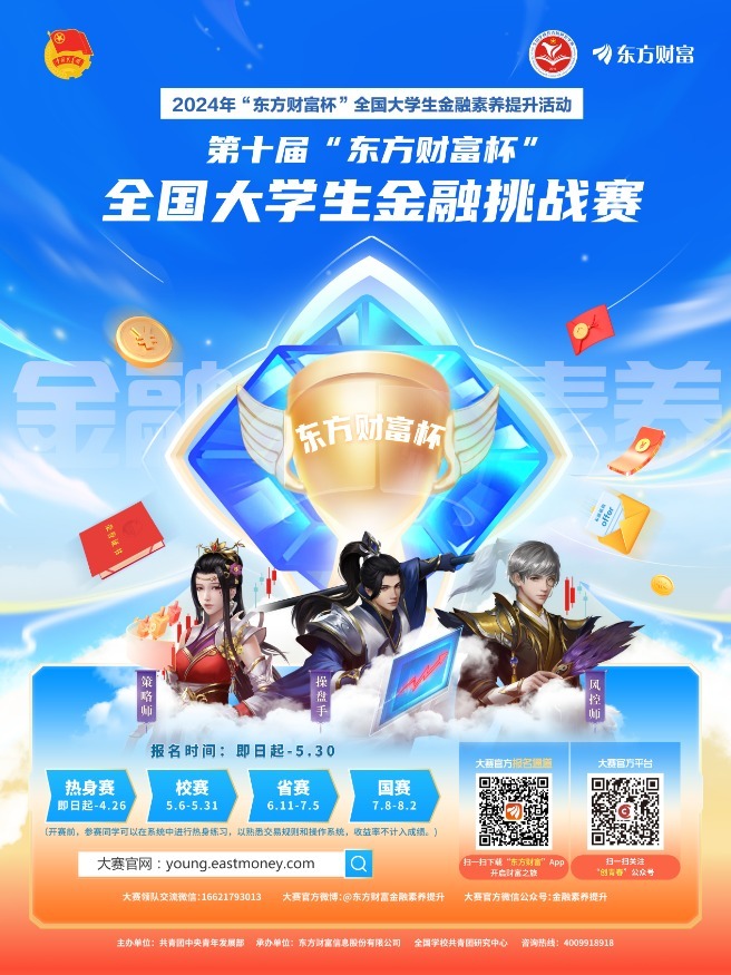 第十届“东方钞票杯”宇宙大学生金融挑战赛分为校赛、省赛和国赛三个阶段。参赛学生及团队使用大赛专用平台,以沪深上市的A股品种进行比拼。