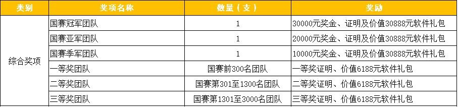 国赛冠军团队获30000元奖金及评释;国赛亚军团队获20000元奖金及评释;国赛季军团队获10000元奖金及评释,国赛冠亚季军团队成员均可赢得价值30888元的软件大礼包一份。