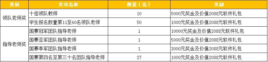 优秀请示诚恳:国赛冠军团队请示诚恳获10000元奖金;国赛亚军团队请示诚恳获5000元奖金;国赛季军团队请示诚恳获3000元奖金;国赛第四名至第三十名团队请示诚恳获1000元奖金。