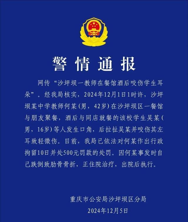 就网传“重庆一中学考验酒后咬掉学生半只耳朵”一事,12月5日,彭湃新闻从重庆市公安局沙坪坝折柳局获悉,经该局核实,2024年12月1日1时许,沙坪坝某中学考验何某(男,42岁)在沙坪坝区一餐馆与一又友聚餐,酒后与同店就餐的该校学生吴某(男,16岁)等东说念主发生黑白,后拉扯吴某并咬伤其左耳致轻浅伤。当今,该局已照章对何某作出行政拘留10日并处500元罚金的处罚。缘何某事发时我方颠仆致肋骨骨折,正入院休养,出院后膨大。