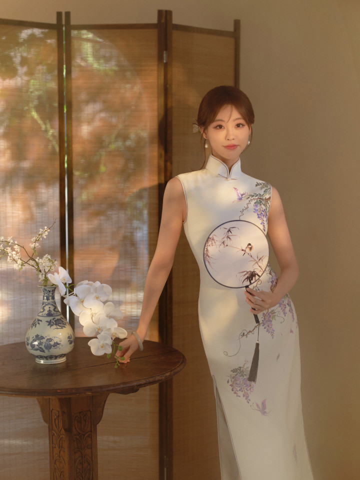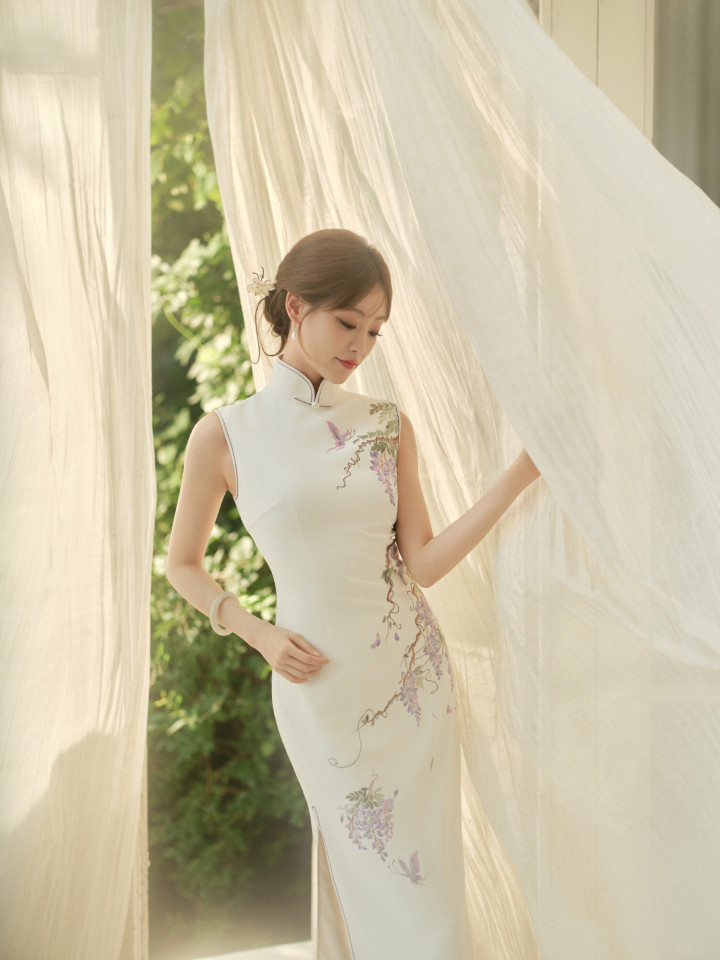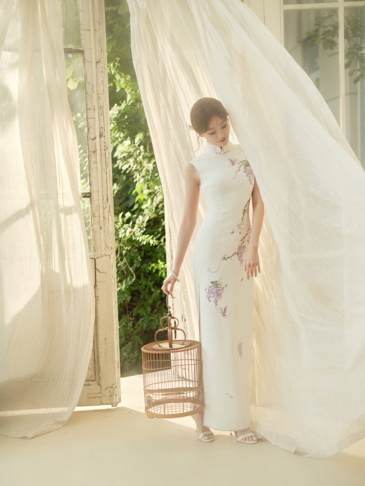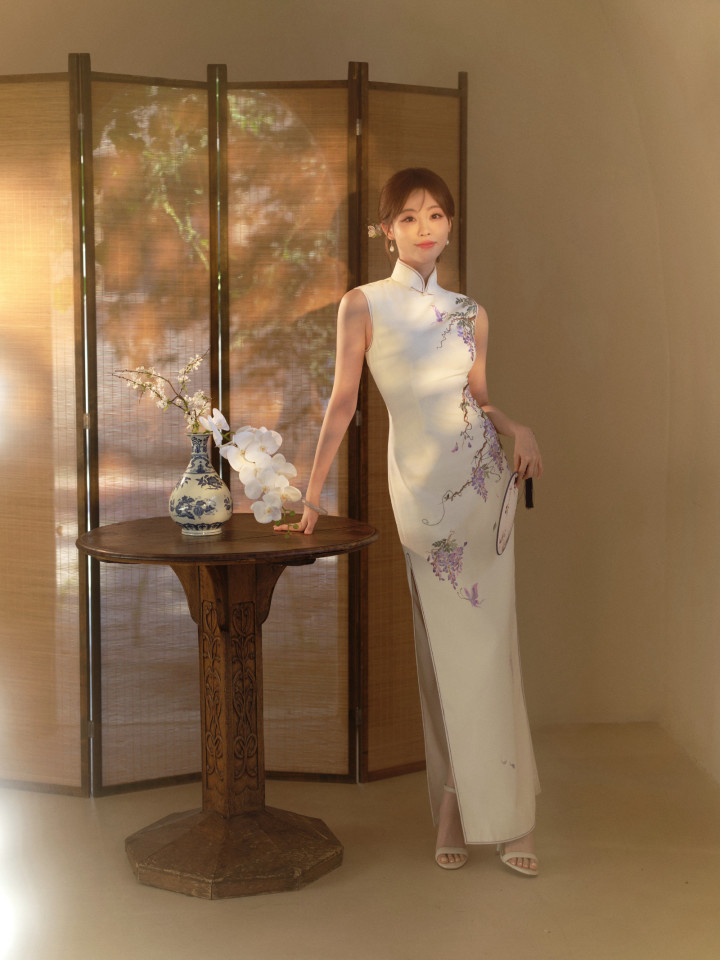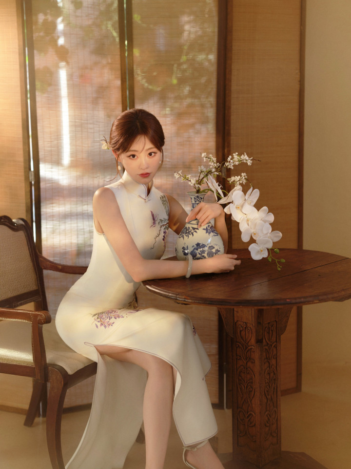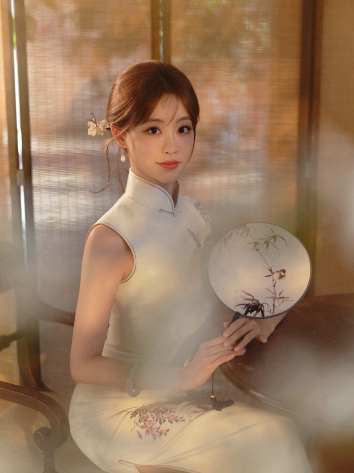 这组写照中,祝绪丹身着白色的国风旗袍修身长裙,上头刺绣着不着名的植物,给这套着装点缀出了色调。从这组写照中咱们不错看出祝绪丹的热心尔雅,知书达理,妥妥的巨室大姑娘气质。