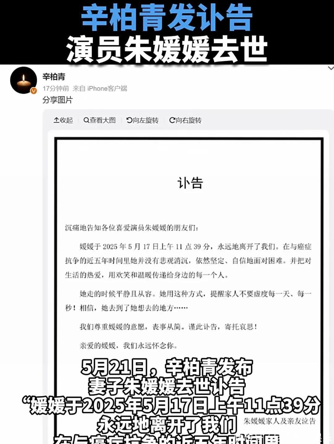 辛柏青更像她的“专属铠甲”,推掉扫数使命全程陪护,却在她眼前恒久笑着说“会好的”。直到2025年5月17日,朱媛媛也曾走了,辛柏青没坐窝奉告亲一又,连岳父母都是第二天才知谈。5月21日,他在顶住账号发了讣告,头像换成玄色烛炬,从此再没更新过。刘天池急着发音尘问真假,只收到一个烛炬色彩,之后就透顶失联了。