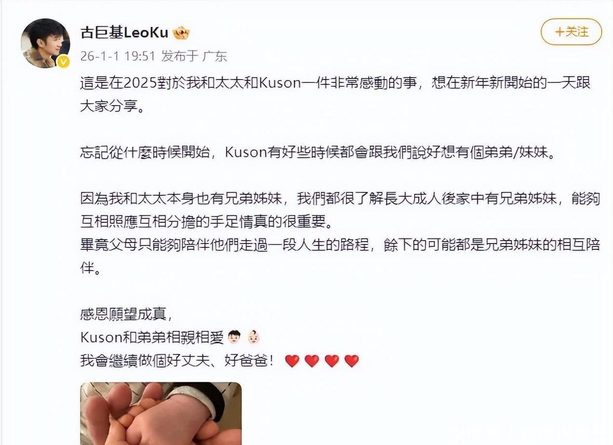 2026年的第一天,文娱圈里传来第一条佳音,是古巨基通知有了二胎,他我方在叮属平台上官宣的。正本因为宗子Kuson但愿有个伴儿,他们就决定再添个孩子,但愿能留住一份亲情,把手足姐妹的人缘接续证实光大。