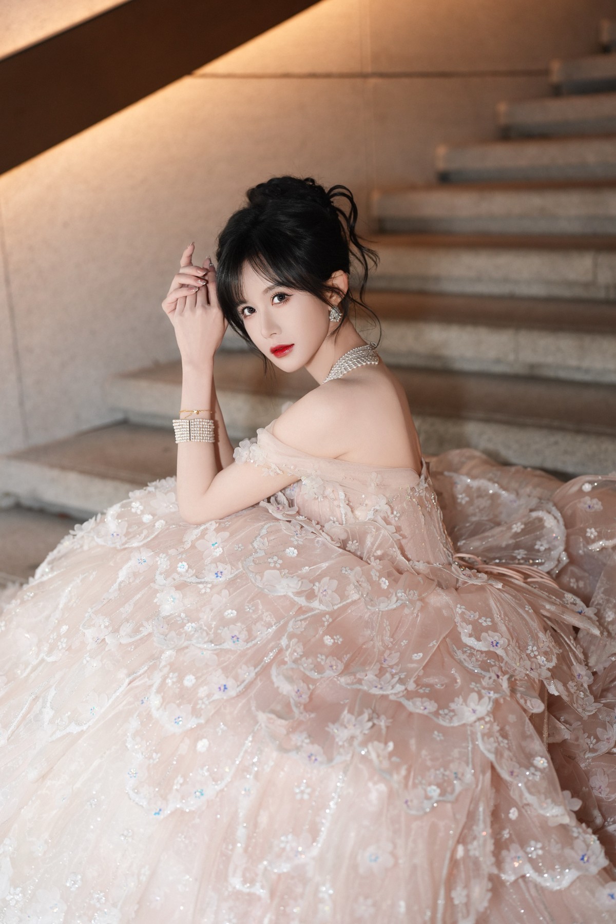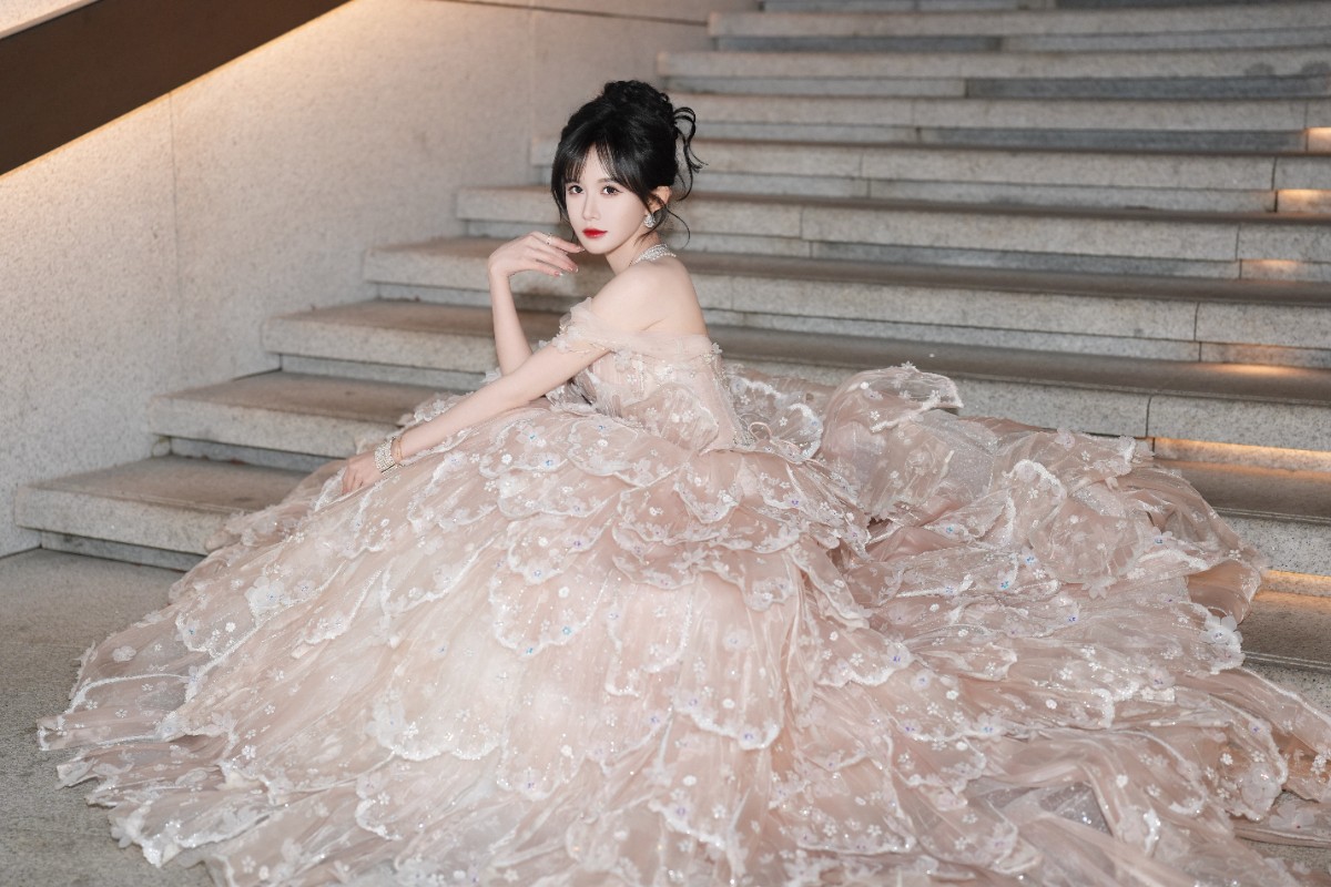 而那条裸粉色驯顺,险些是为她量身定制的氛围感神器!层叠的纱绡如云似雾,手工缝制的立体花朵缀满裙身,在灯光下泛出珍珠母贝般的虹彩光泽。蓬松裙摆像一朵正在盛放的玫瑰,烂漫又柔嫩;背后的露背诡计却偷偷勾画出畅达肩颈线,优雅中透出一点恰到克己的性感张力。每一派纱的垂坠、每一朵花的位置,皆和举座“甜中带飒”的调性严丝合缝——坐在楼梯间那一刻,她整个东谈主仿佛被星光和缓包裹,好意思得让东谈主屏息。