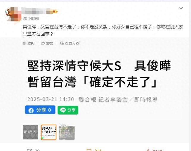 具俊晔的淹留决定并未获取 S 家的认同。3 月 15 日大 S 埋葬时,具俊晔冒雨出席却遭苛待:小 S 与 S 妈全程未与其交流,送葬戎行中也难觅他的身影。