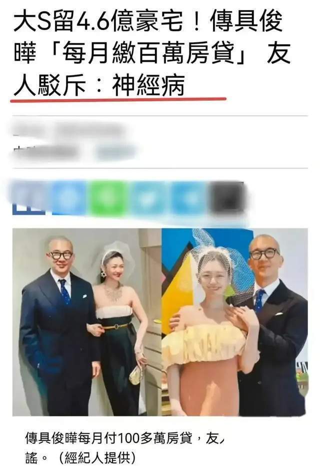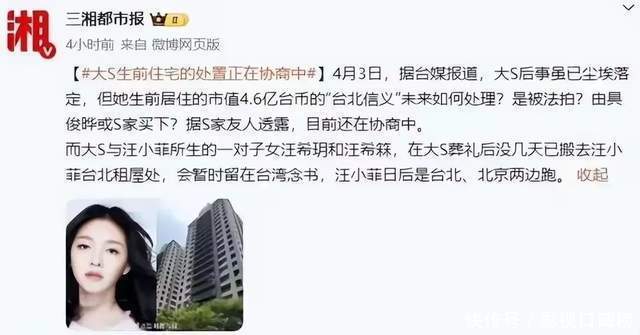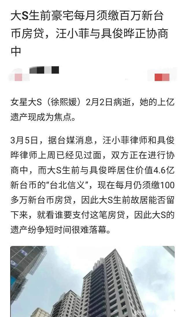 3月份有媒体报说念汪小菲的讼师一经找具俊晔协商大S生前的豪宅一事。据说,汪小菲一经断供了,流传具俊晔收到催交房贷的账单,他置之不睬,是以这套豪宅进行法拍。