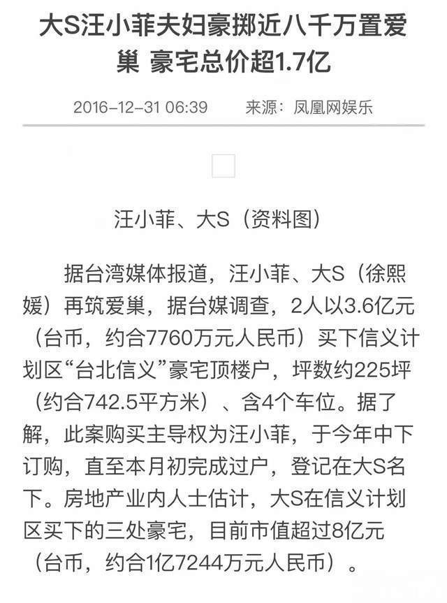 房款是汪小菲支付,名字是写大S的。原因是汪小菲不是中国台湾籍,是以不大略写他的名字。这一套豪宅亦然曾经两东说念主的爱巢,有许多的回忆。