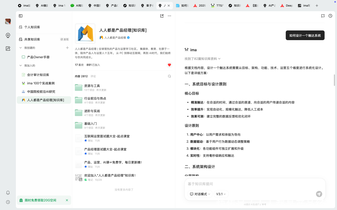 现时,通过「东谈主东谈主都是居品司理常识库」,环球掀开常识库后不错平直发问,比如发问“怎样瞎想一个触达系统”,ima 常识库的「智能问答」就会集中咱们常识库里的内容,将同业共享的实践陶冶、最新的行业案例、筹谋领域的居品调研答谢,以及腾讯公众号优质著述等竟然的内容源,不错很猛进度地镌汰 AI 的幻觉,平直生成一个结构化的瞎想决议: