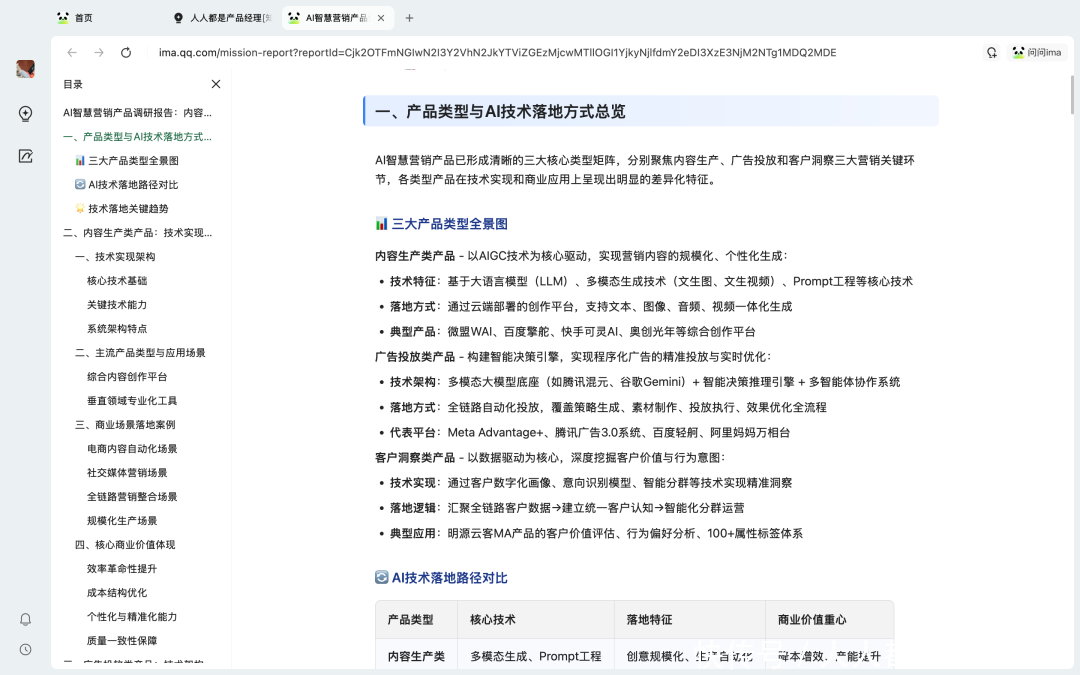 之前社区能提供的匡助,主要如故在内容层上头给环球提供最新的行业趋势答谢,以及同业的最新实践,现时,通过「东谈主东谈主都是居品司理常识库」,集中 ima 常识库的「任务模式」,咱们不错平直一句话就生成最终的调研答谢。
