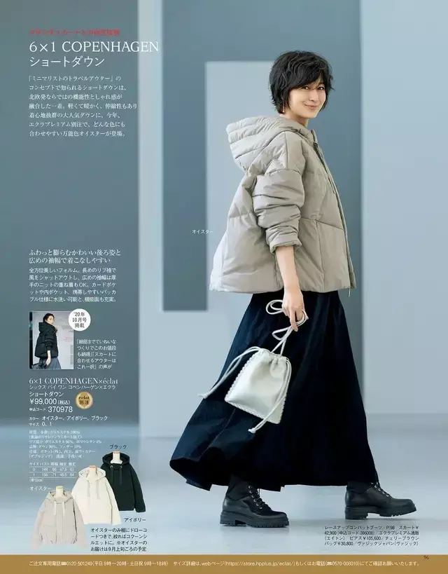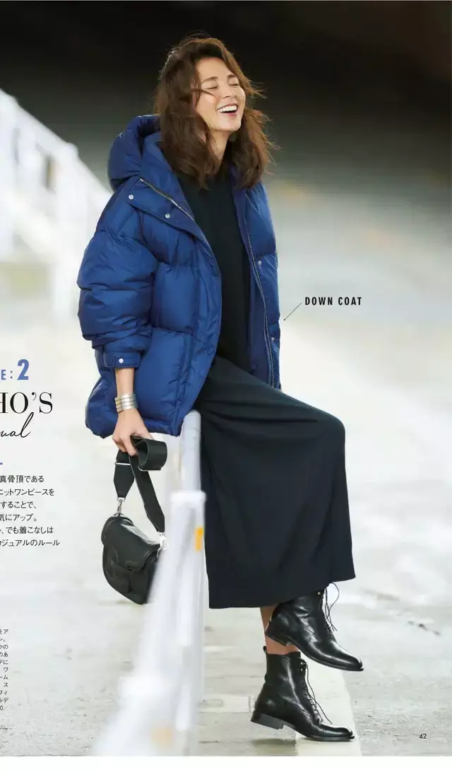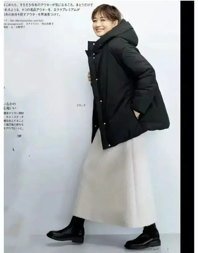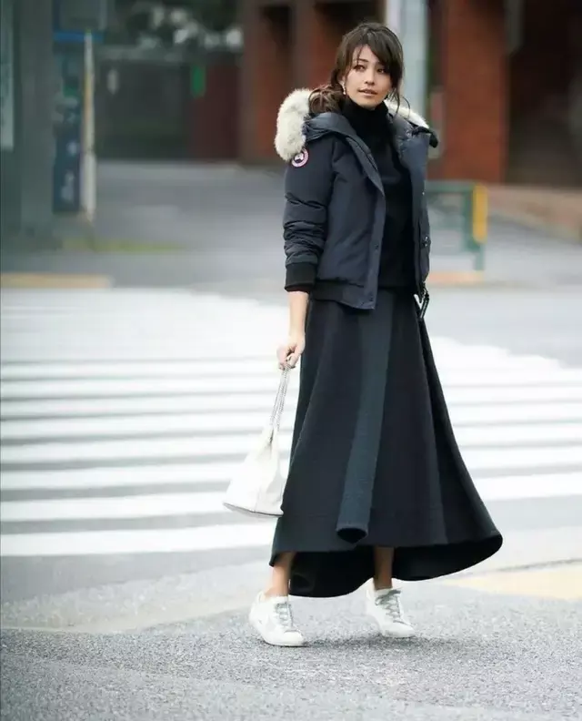 诚然仍是参加了冬末与初春的轮流时节,但天气早上和晚上照旧很凉,这技巧照旧需要穿上御寒应允的外衣才行。这技巧我们可以像富冈佳子一样,用一件短羽绒服搭配上玄色的伞状半身裙,这种“上短下长”的搭配神情确乎辞谢易压个子,显高显瘦。