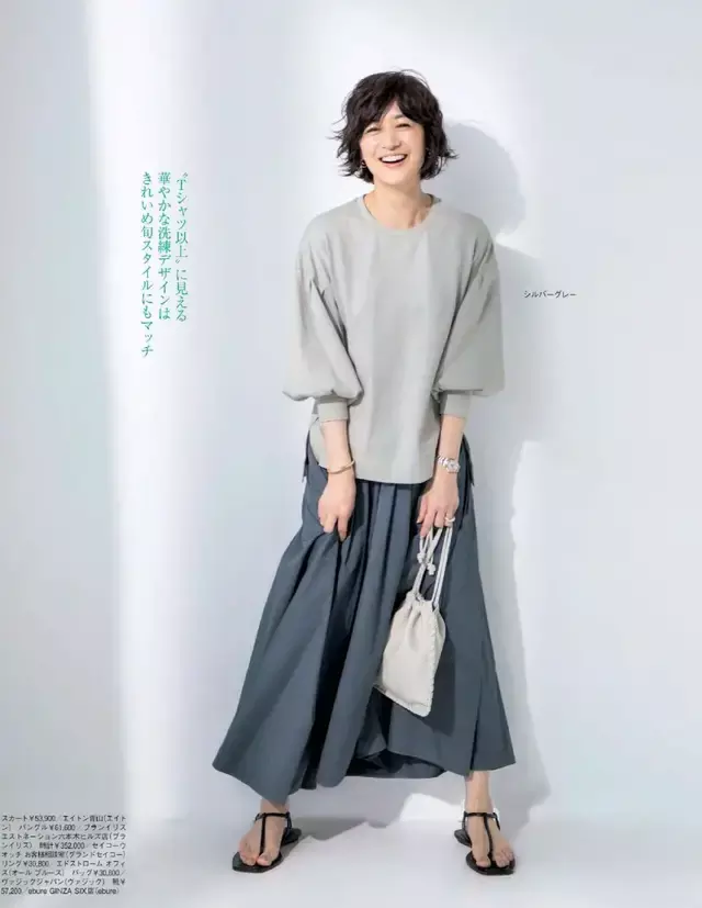 千万不要刻意去装嫩,别遴荐短裙来穿戴,中长裙愈加合适面子,也可以像富冈佳子一样,遴荐一条灰色的中长裙,裙脚卡在膝盖位置最好,何况版型是直筒项目或伞状项目,不成遴荐包臀裙,那样很容易泄漏自己躯壳劣势,腿粗胯宽等问题遮不住。