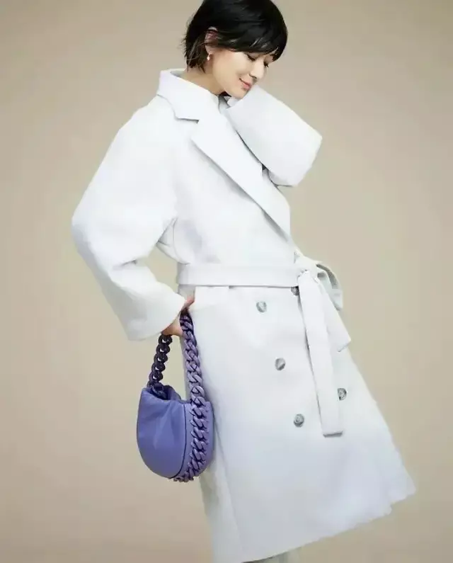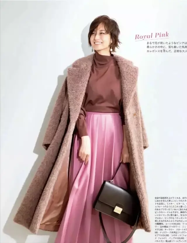 好意思拉德色系“大衣”穿在身上确乎更显耀气,内部穿的同色系的打底衫,加上一条粉紫色的高腰收腰压褶伞状项目半身裙,举座呈现成果千里稳不老气,充满了高等感。