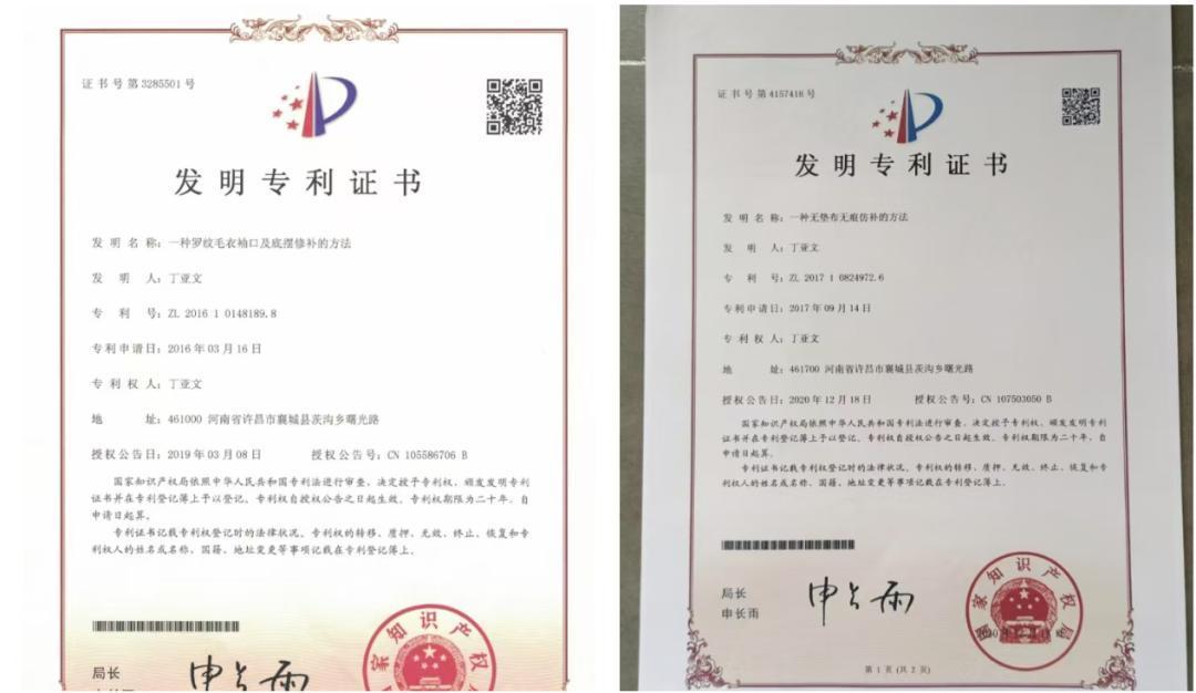 从街边摆摊,到领有我方的店铺,丁亚文的技术也越发精炼。2013年,丁亚文“一种无垫布无痕纺补的圭臬”专利央求奏凯,在2019年、2020年,她又继续拿下“一种无痕纺补的圭臬”“一种螺纹毛衣袖口及底摆修补的圭臬”两项国度专利。